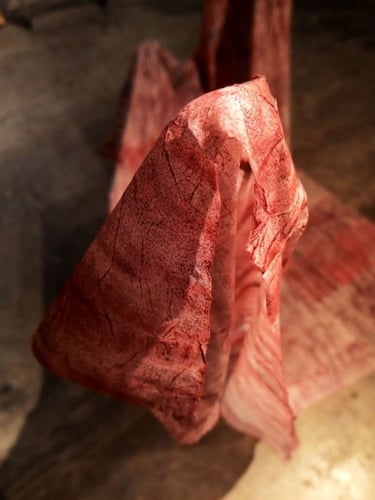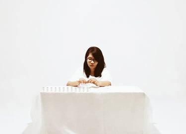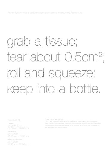 One at a time; Tear and Roll, 2014 .. Performance, tissue and plastic bottles with cover
