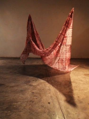 The dialogue, 2014 .. Tissue papers, oil color, glue and fishing threads